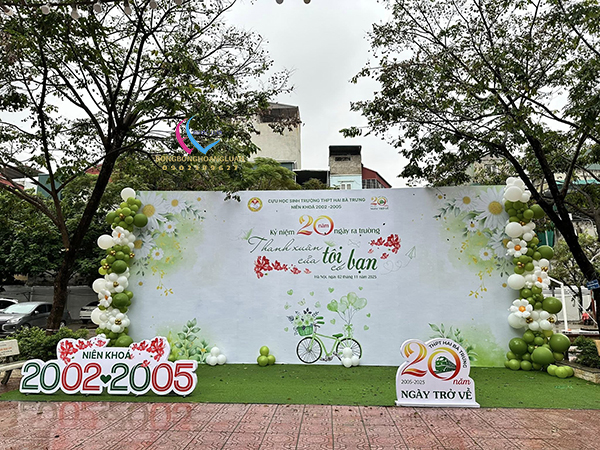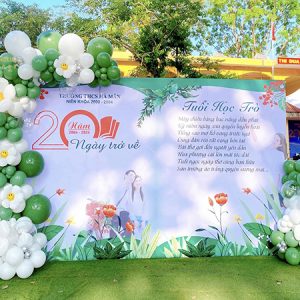 Backdrop kỷ niệm 20 năm ngày trở lại được thiết kế theo phong cách bảng đen, cổng sân trường, nhật ký lưu bút, sách vỡ….gợi nhớ mái trường xưa cho những ai đã rời ghế nhà trường nhiều năm và ngày trở lại. Họp lớp cũng thường được tổ chức ở những địa điểm ấm cúng, thân mật. Đây là nơi để mọi người cùng nhau chụp ảnh lưu giữ lại kỷ niệm và chia sẻ cùng mọi người sau mỗi lần họp mặt.