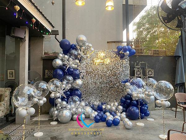 Backdrop sinh nhật bằng sequin bạc được thiết kế cầu kỳ với tông màu bạc sang trọng kết hợp với bong bóng tạo hình nghệ thuật trang trí trên backdrop, ánh sáng của chữ đèn led màu trắng làm gia tăng thêm sự đặc biệt cho sản phẩm.