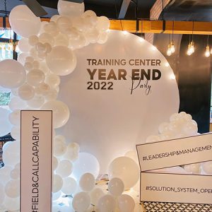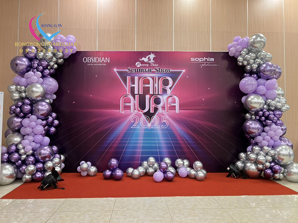 Mẫu background tiệc tất niên trang trí bóng bay: Bóng bay là vật decor được sử dụng khá phổ biến khi trang trí background tiệc tất niên, giá thành vừa phải và phù hợp nhiều concept khác nhau. Một cách làm được nhiều người áp dụng là trang trí bóng bay vòng quanh khung backdrop, thường sử dụng nhiều màu kết hợp như trắng – bạc – đen, hay trắng – vàng , tùy thuộc vào hình ảnh công ty và concept tổ chức.
