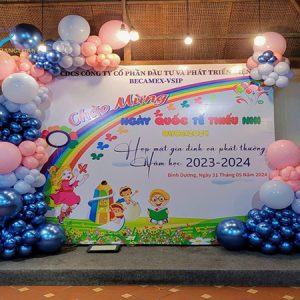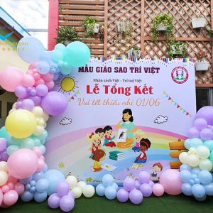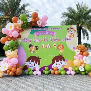 Mỗi sản phẩm sẽ được bơm từ khoảng 150-200 quả bóng có kích thướt đồng đều kết thành chùm 4 quả bóng kết thành chùm theo hình xoắn ốc. Dây bóng sẽ được đính kết viền xung quanh backdrop không chỉ che đi những khuyết điểm xấu ở 4 gốc mà trở nên cuốn hút sự chú ý của các bé cũng như các phụ huynh đi cùng vào ngày lễ quốc tế thiếu nhi 1/6.