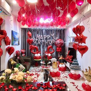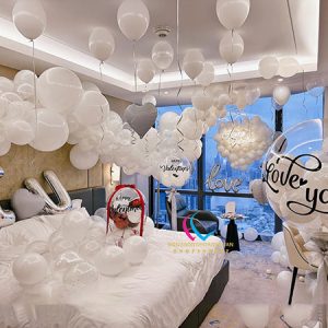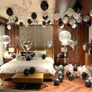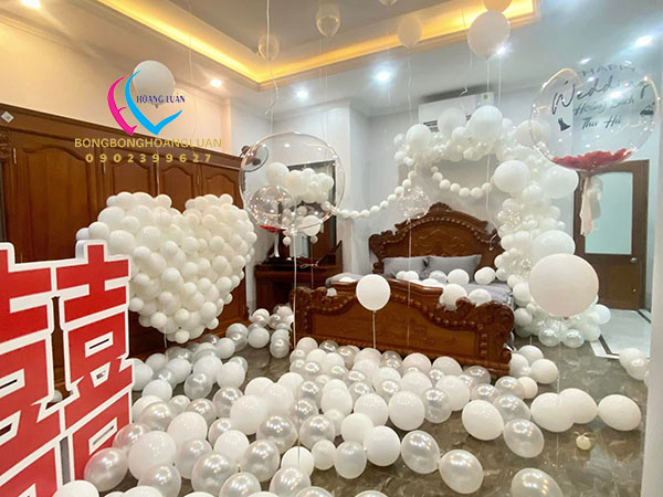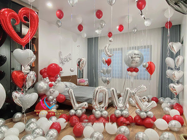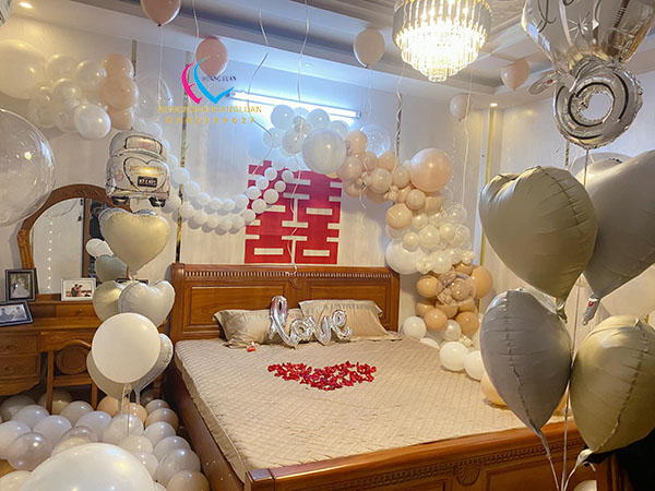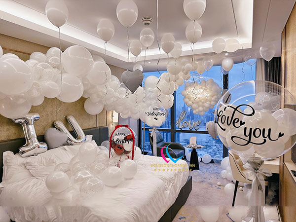 Bên cạnh những chiếc bóng bay được bày trí phối màu một cách hài hòa trang nhã bạn có thể chuẩn bị thêm một bó hoa thật lớn, một chiếc bánh kem, một món quà mà đối phương yêu thích đặt trên giường sẽ mang lại niềm vui bất ngờ , ghi đậm vào khoảng thời gian hạnh phúc bên nhau.