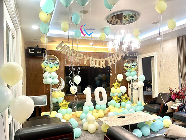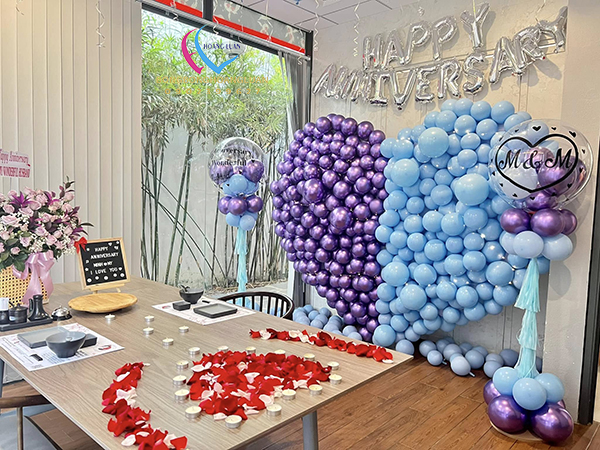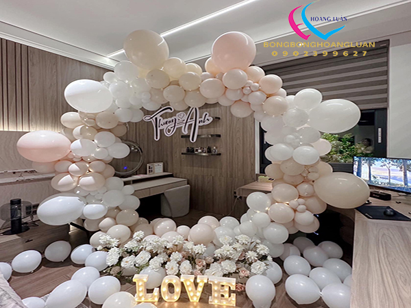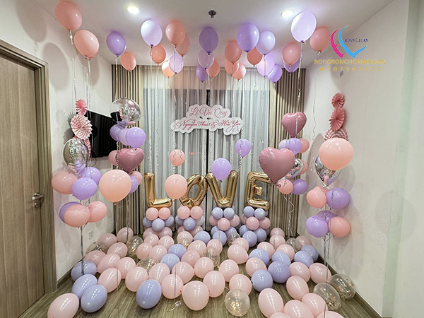 Tốt nhất nên chọn tone màu trang trí trước sau đó tìm mua bóng bay phù hợp. Hãy cho những quả bóng thật sự nổi bật, có thể ghi lên vài thông điệp yêu thương. Sau đó buộc thành chùm hay thả trần nhà, hoặc thả sàn. kết hợp với hoa tươi và nến tạo nên một không gian lãng mạn ngọt ngào cho ngày trọng đại.