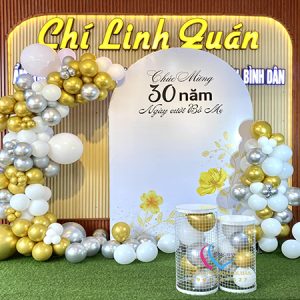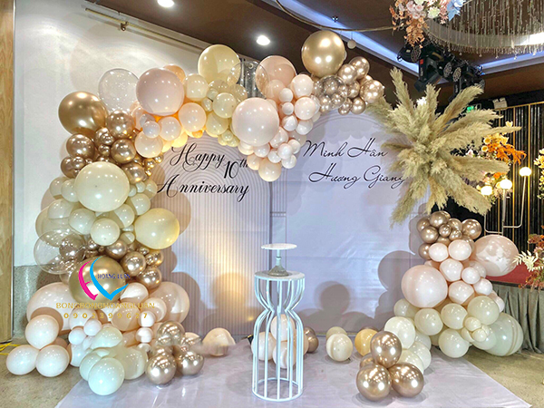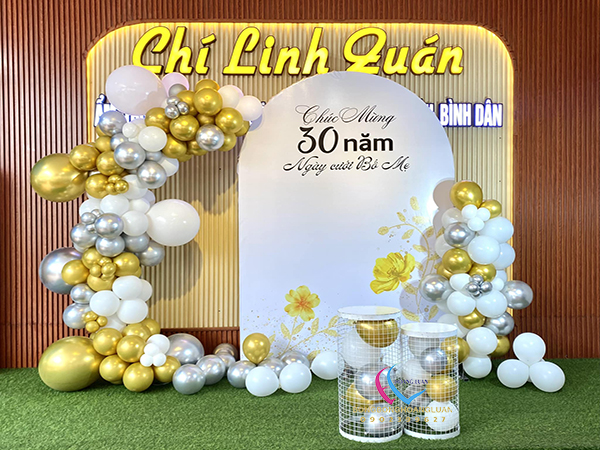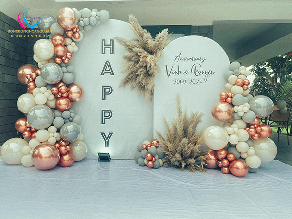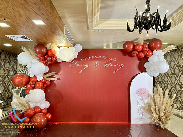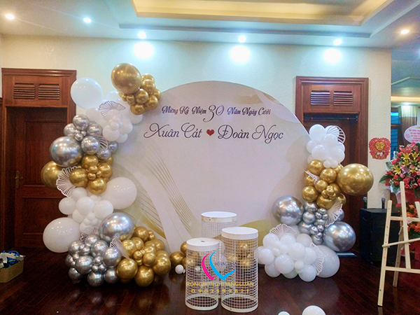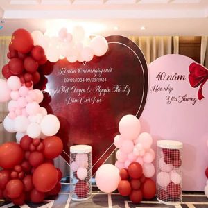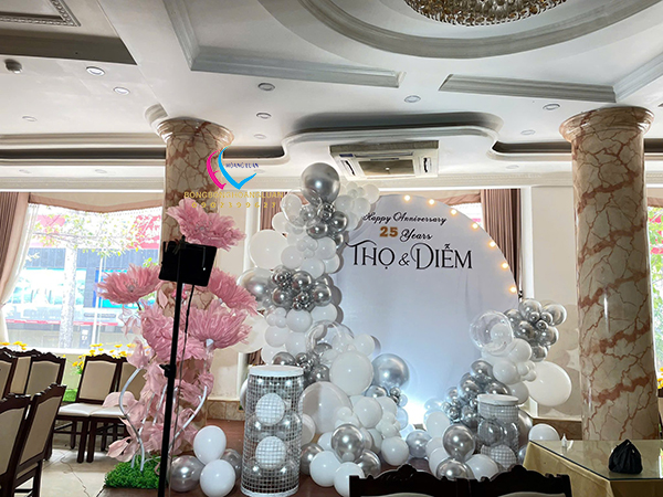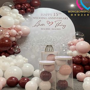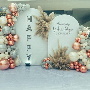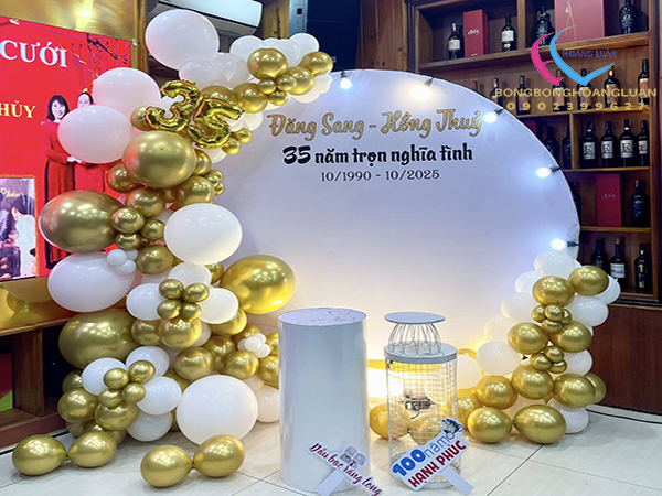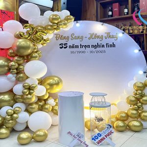 Backdrop klhung hình tròn kết hợp với trang trí bong bóng kỷ niệm 35 năm ngày cưới là tác phẩm được thi công đơn giản nhanh chóng, tượng trưng cho sự gắn bó bền lâu và tình yêu son sắc vĩnh cửu. Không chỉ tôn vinh vẻ đẹp viên mãn của tình yêu, mà còn gửi gắm lời chúc “trăm năm tình viên mãn – bạc đầu nghĩa phu thê” sâu sắc.