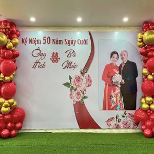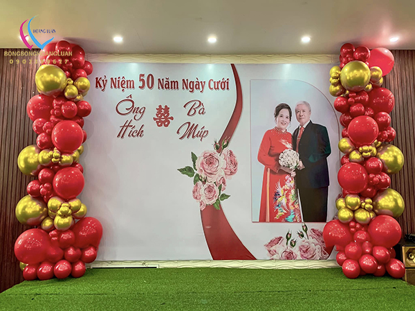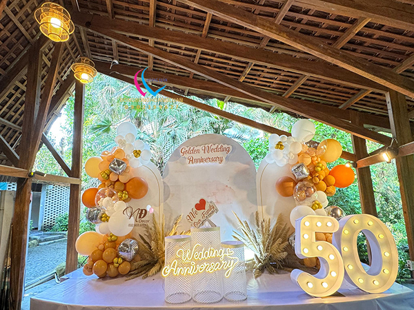 Nửa thế kỷ bên nhau là cả một hành trình dài của yêu thương, sẻ chia và đồng hành. Phông nền được trang trí bằng bóng bay nghệ thuật kết hợp hoa cỏ lau– như một lời chúc phúc cho cuộc sống viên mãn, an yên đến trọn đời.