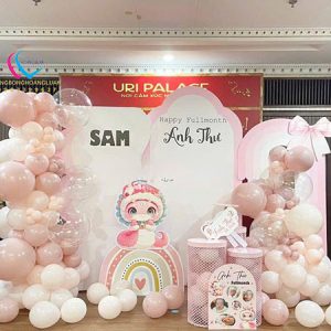 Trang trí tiệc sinh nhật trọn gói với backdrop bóng bay là sản phẩm Hoàng Luân đặc biệt thiết kế cho bé yêu thích màu hồng, màu tím nhẹ nhàng thanh tao. Sản phẩm có khung hình tròn tượng trưng cho mặt trăng tròn vành vạnh có kích thướt 2m4, bong bóng trang trí nổi bậc trên backdrop được tạo hình phối màu một cách độc đáo, sáng tạo phù hợp với không gian sự kiện. Trong sản phẩm số 8 in trên backdrop nổi bậc cùng tên chủ nhân bữa tiệc để khách mời dễ dàng nhận biết.