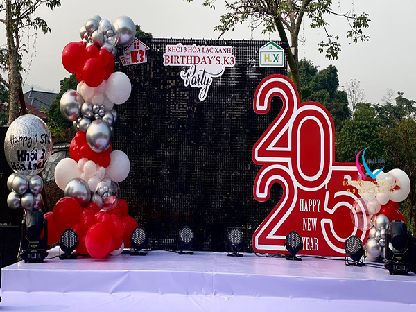 • Trang trí thêm line bong bóng, hoa tươi trên background hoặc cũng có thể đặt bên cạnh sân khấu một quả bóng Jumbo có kích cỡ to lớn, bắt mắt nhằm nâng cao tính thẩm mỹ của sự kiện